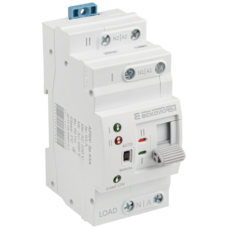 | Призначення | Автоматичне перемикання вводів у разі зникнення/відновлення напруги живлення на пріоритетному вводі (I). Додатково перемикання між вводами (I-II) можна здійснювати у ручному режимі |